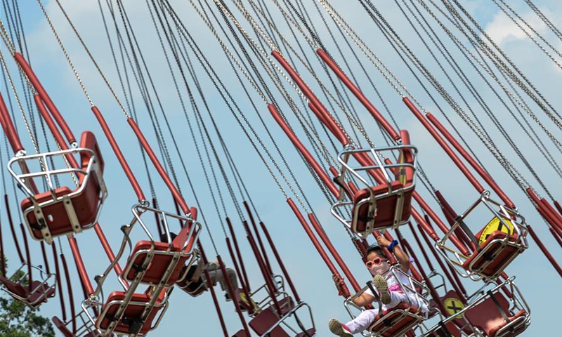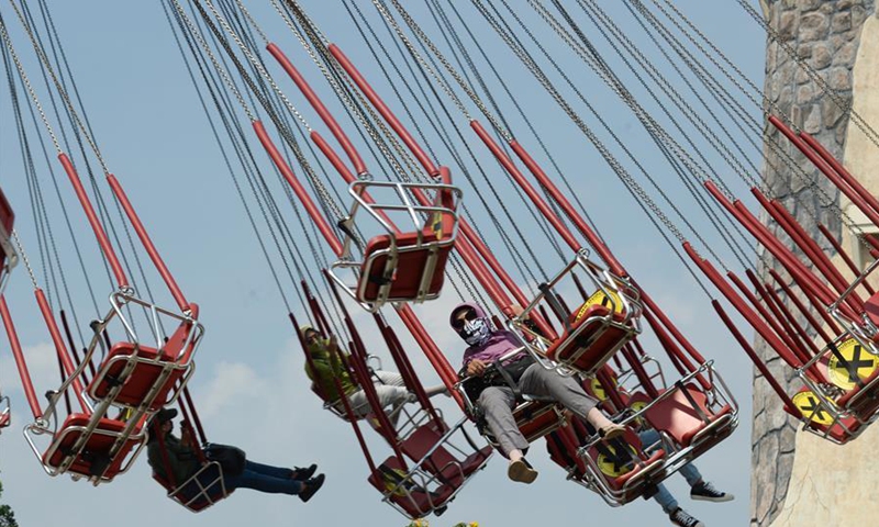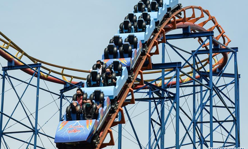 Tourists wearing face masks have fun on the first day of reopening for public at Dunia Fantasi (Dufan) in Ancol Dreamland Park complex, Jakarta, Indonesia, June 20, 2020.Photo:Xinhua
