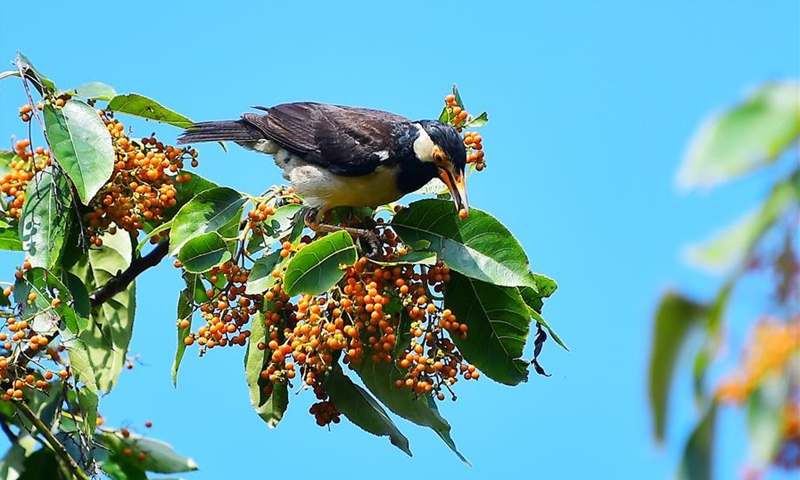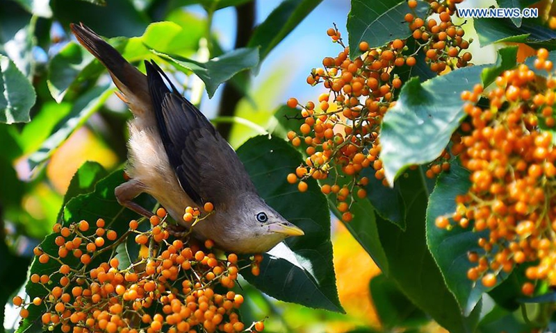 A bird eats wild fruits in the outskirts of Agartala, the capital city of India's northeastern state of Tripura, June 20, 2020. (Str/Xinhua)