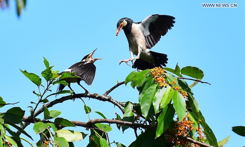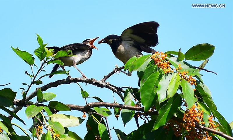 Birds are seen eating wild fruits in the outskirts of Agartala, the capital city of India's northeastern state of Tripura, June 20, 2020. (Str/Xinhua)