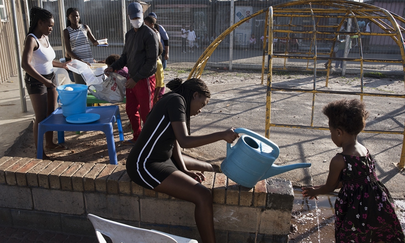 Children wash their hands at a crèche in Langa, near Cape Town on May 14, before receiving a meal, which is part of a project to feed people made vulnerable under the lockdown in South Africa, as a result of COVID-19. Photo: AFP