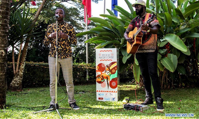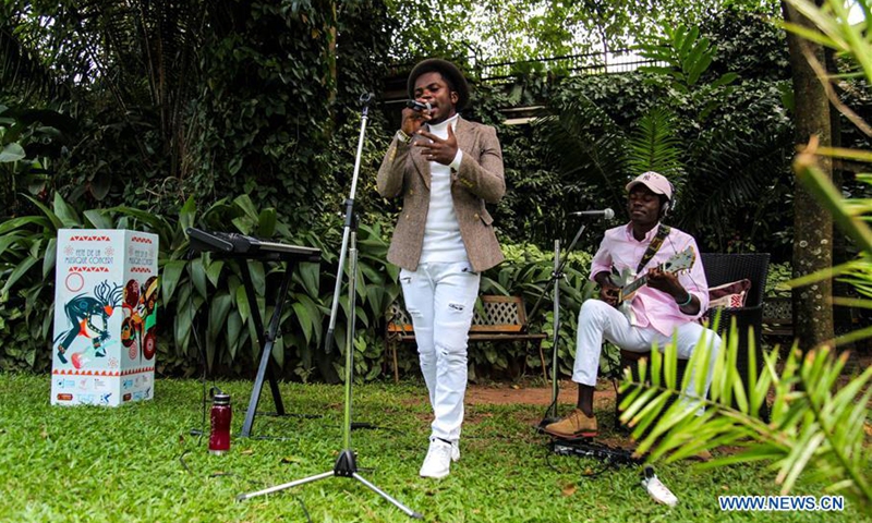 Ugandan music artist Joel Sebunjo (L) performs during an online concert to mark the World Music Day in Kampala, Uganda, on June 21, 2020. As a measure to contain the spread of COVID-19, all major events including concerts and music shows were canceled to enforce and promote social distancing in Uganda. (Photo by Hajarah Nalwadda/Xinhua)