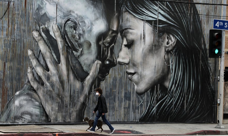 A man wearing face mask walks his dog at the Art District, downtown Los Angeles, the United States, April 10, 2020. (Xinhua)
