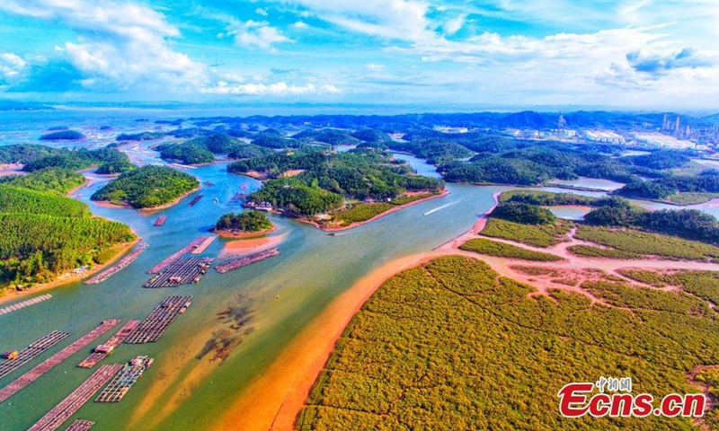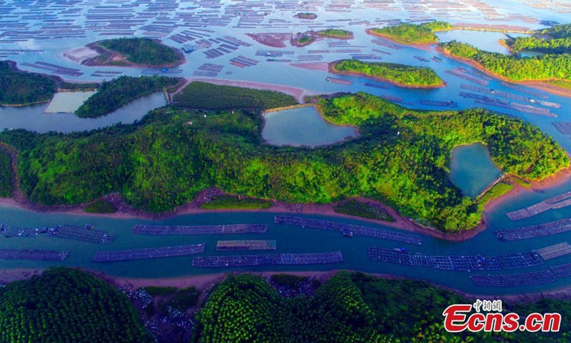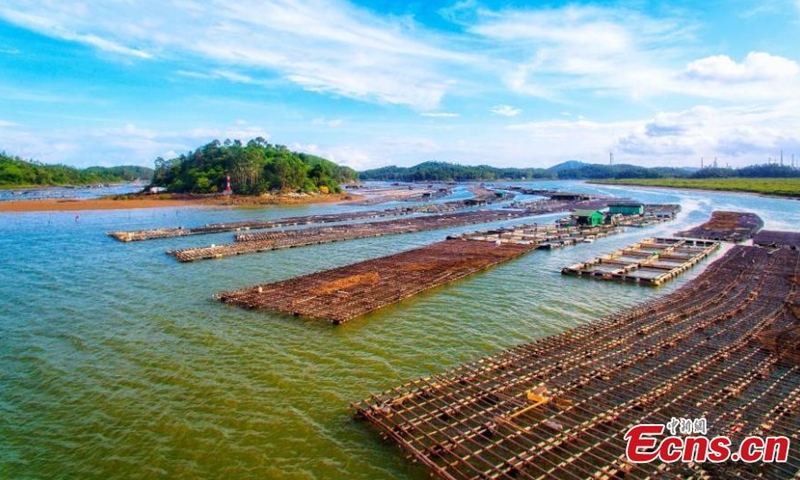 Aerial photo taken on June 21, 2020 shows the oyster cultivation fields in Qinzhou City, south China's Guangxi Zhuang Autonomous Region. With the advantage of the location of Maoweihai natural harbor, Qinzhou has developed an oyster industry which has a cultivation field of 158,000 Mu (about 10,533 hectares) and a complex output value of about 3,000 million Yuan (435.97 million US dollars). (Photo/China New Service)