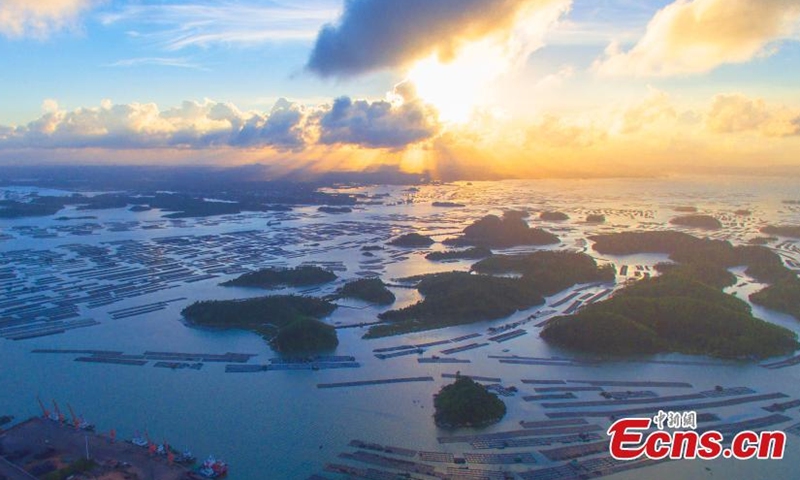 Photo taken on June 21, 2020 shows floating rafts for oyster culture in Qinzhou City, south China's Guangxi Zhuang Autonomous Region. (Photo/China New Service)
