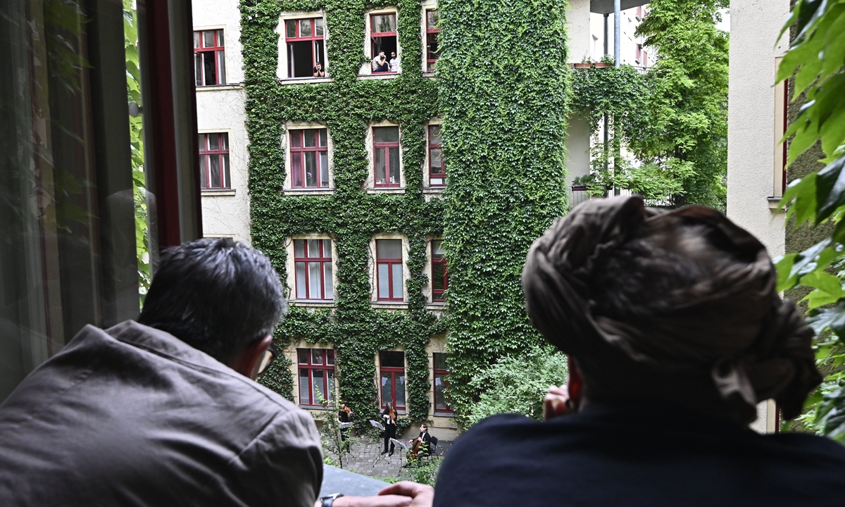 Residents listen to a backyard concert by members of Berlin's Staatskapelle orchestra on June 9. Photo: AFP