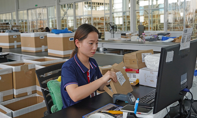 An employee sorts and packages e-commerce orders at a cross-border trade company in Rongcheng, East China's Shandong Province on Tuesday. Offical data showed China's exports rose 1.4 percent year-on-year in yuan terms in May, while imports fell 12.7 percent. Photo:cnsphoto