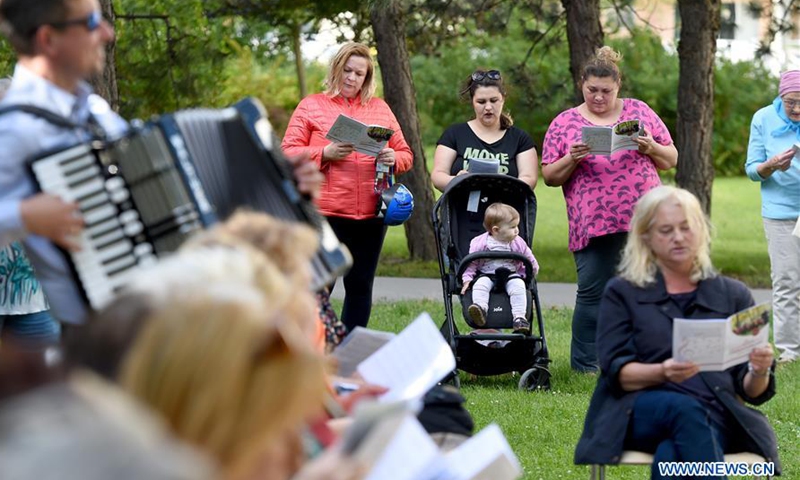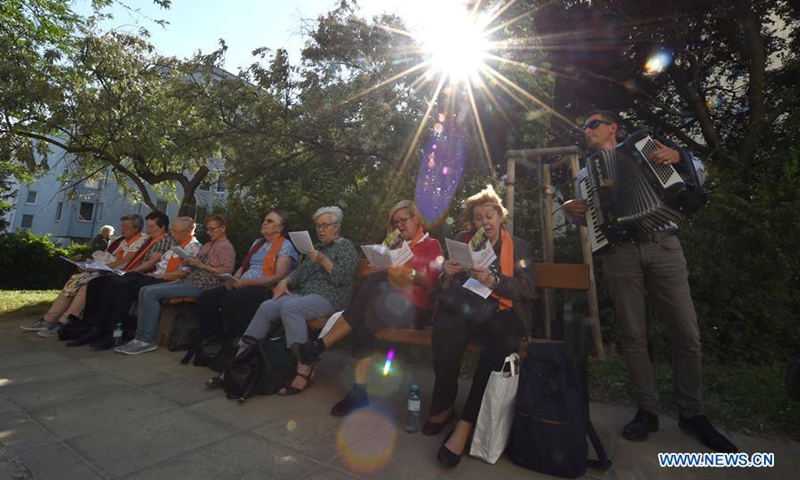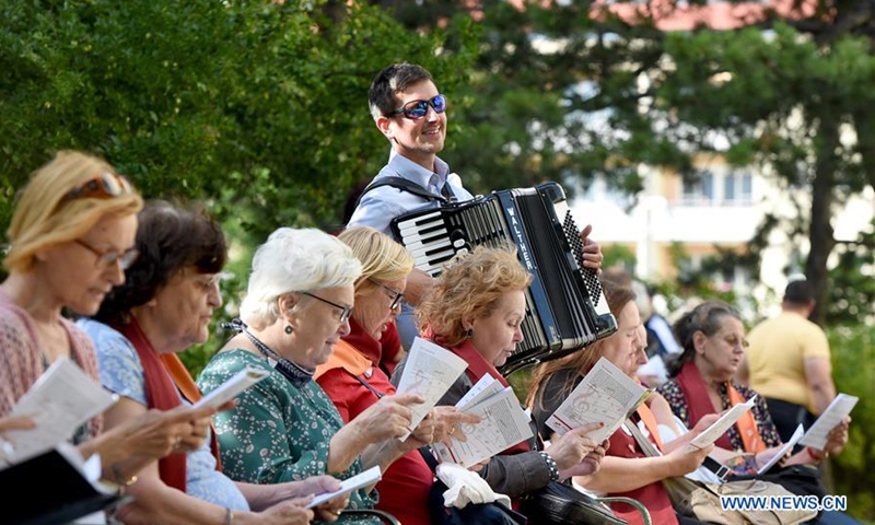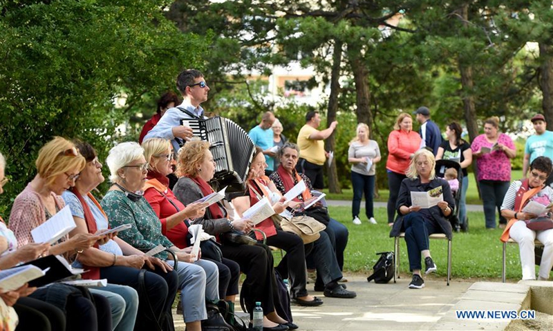 Local residents gather as members of the 1st Viennese Community Choir sing for residents at a community in Vienna, Austria, on June 22, 2020. Members of the 1st Viennese Community Choir gave a performance at a community in Vienna on Monday, the first time since the lifting of COVID-19 restrictions. The choir, founded in 2008, is composed of ordinary residents. (Xinhua/Guo Chen)