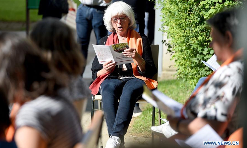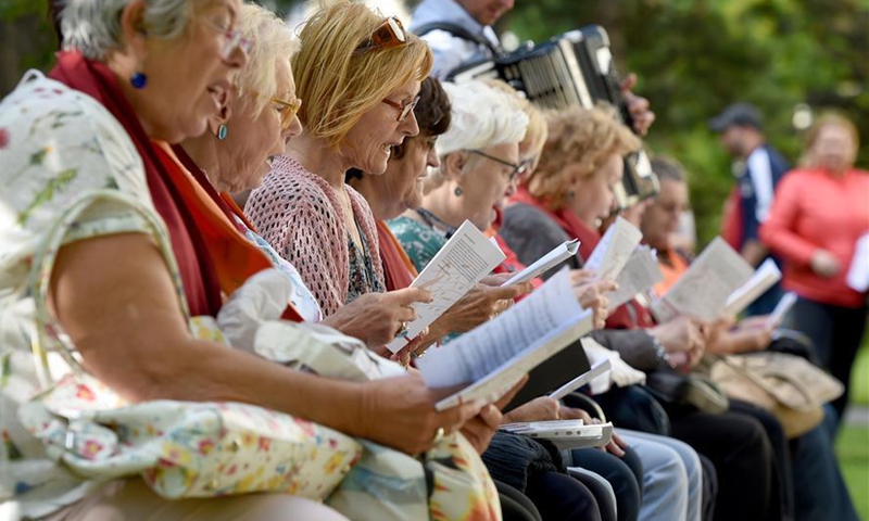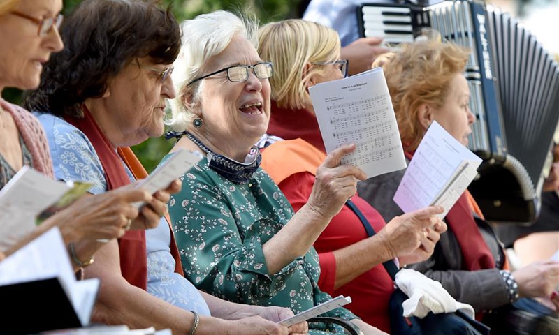 Members of the 1st Viennese Community Choir sing for residents at a community in Vienna, Austria, on June 22, 2020. Members of the 1st Viennese Community Choir gave a performance at a community in Vienna on Monday, the first time since the lifting of COVID-19 restrictions. The choir, founded in 2008, is composed of ordinary residents. (Xinhua/Guo Chen)
