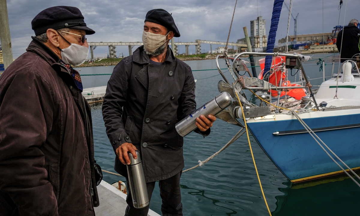 Juan Manuel Ballestero (right) speaks with his father Carlos upon arrival in Mar del Plata, Argentina, from Portugal, on June 20, after sailing for 85 days due to the COVID-19 pandemic restrictions. Photo: AFP