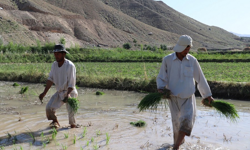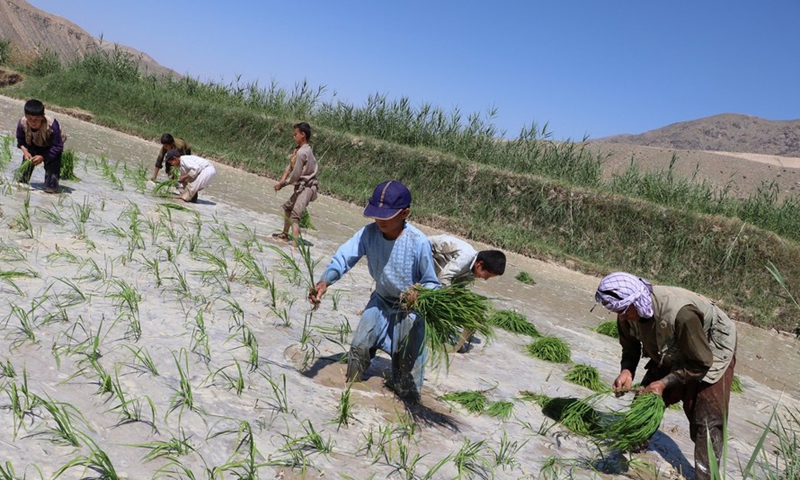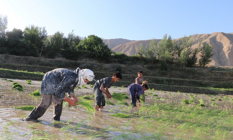 Afghan farmers plant rice seedlings at a paddy field in Andrab district of northern Baghlan province, Afghanistan, June 21, 2020. (Photo by Sahel Nejat/Xinhua)