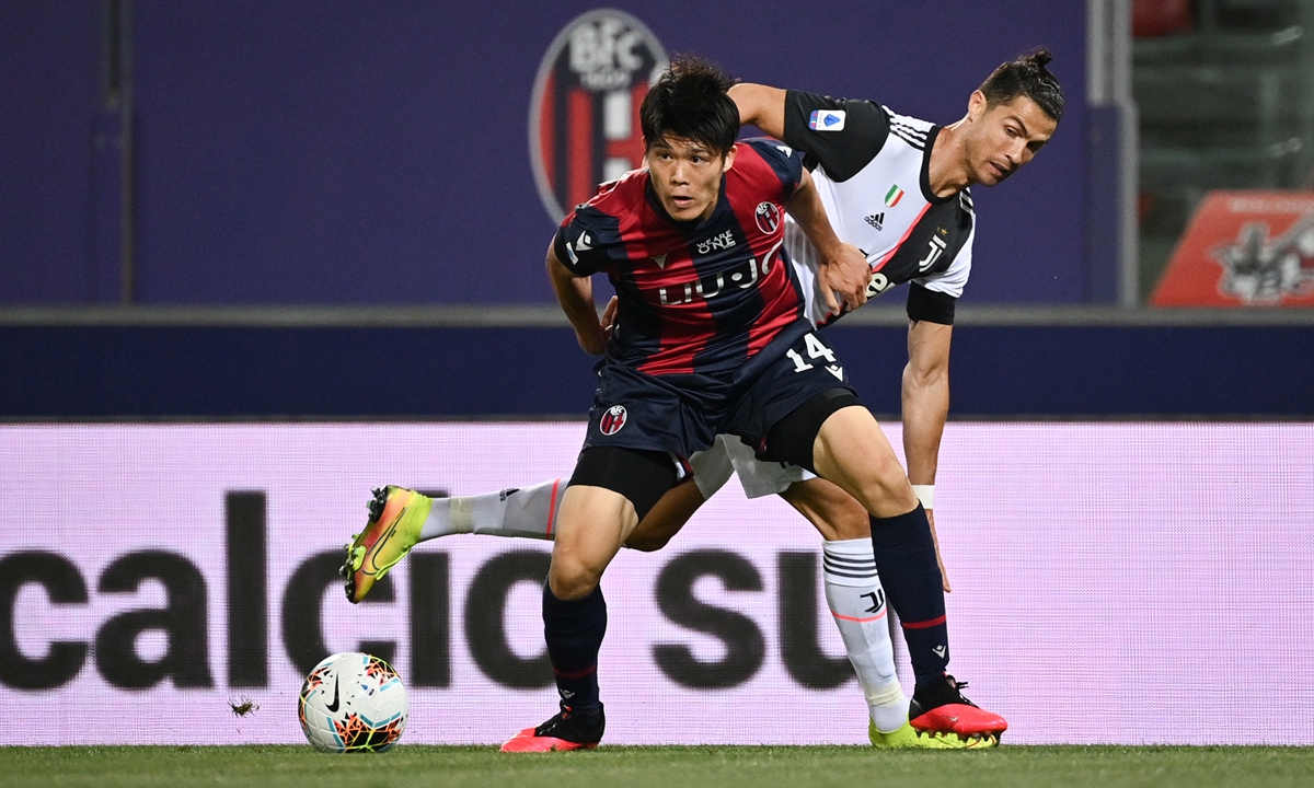 Juventus superstar Cristiano Ronaldo (right) competes with Bologna defender Takehiro Tomiyasu on Monday in Bologna, Italy. Photo: IC