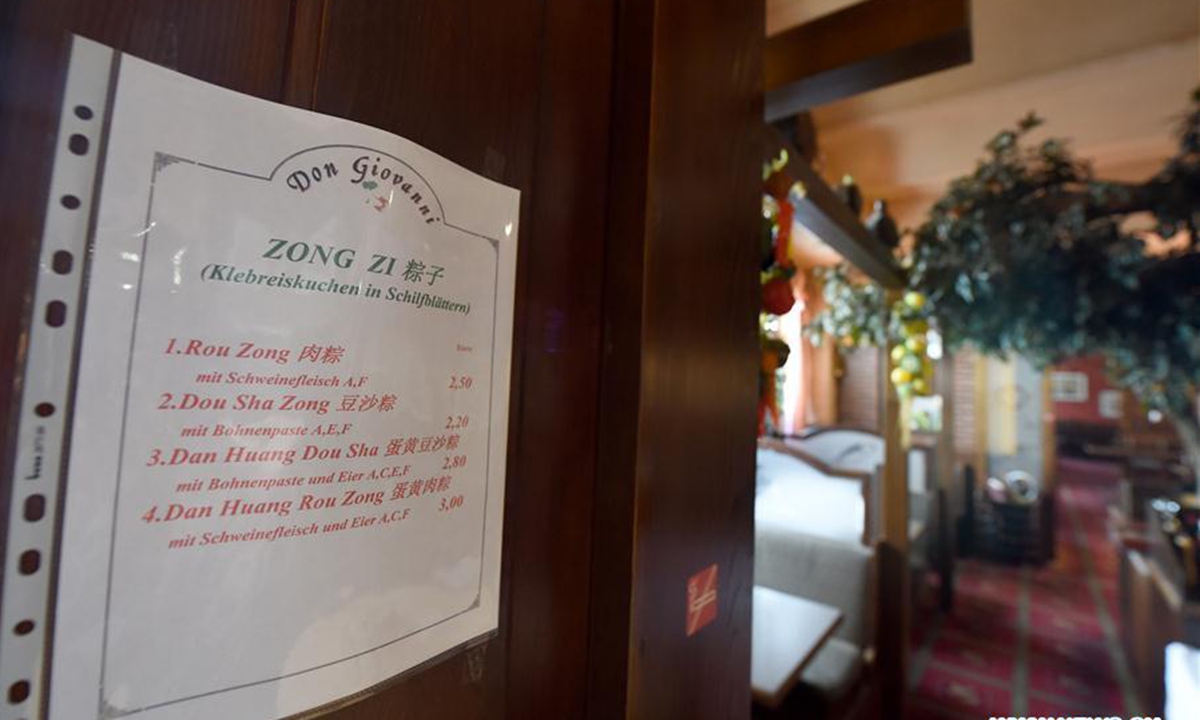 Zongzi menu is seen at restaurant Pizzeria Don Giovanni in Vienna, Austria, June 23, 2020. Zongzi is a traditional Chinese food made of glutinous rice wrapped in bamboo leaves for the occasion of Dragon Boat Festival. The restaurant Pizzeria Don Giovanni, operated by Wu Bing and her husband, serves Zongzi to locals in Vienna as the festival is upcoming. (Xinhua/Guo Chen)