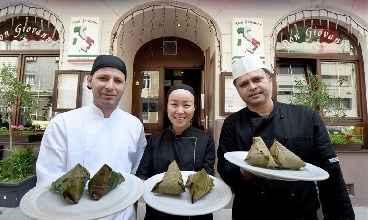 Pizza chef Nuri (R) invites his friend Karin to taste Zongzi at restaurant Pizzeria Don Giovanni in Vienna, Austria, June 23, 2020. Zongzi is a traditional Chinese food made of glutinous rice wrapped in bamboo leaves for the occasion of Dragon Boat Festival. The restaurant Pizzeria Don Giovanni, operated by Wu Bing and her husband, serves Zongzi to locals in Vienna as the festival is upcoming. (Xinhua/Guo Chen)