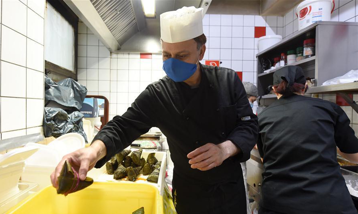 Spaghetti chef Suman (L) puts Zongzi into a box at restaurant Pizzeria Don Giovanni in Vienna, Austria, June 23, 2020. Zongzi is a traditional Chinese food made of glutinous rice wrapped in bamboo leaves for the occasion of Dragon Boat Festival. The restaurant Pizzeria Don Giovanni, operated by Wu Bing and her husband, serves Zongzi to locals in Vienna as the festival is upcoming. (Xinhua/Guo Chen)