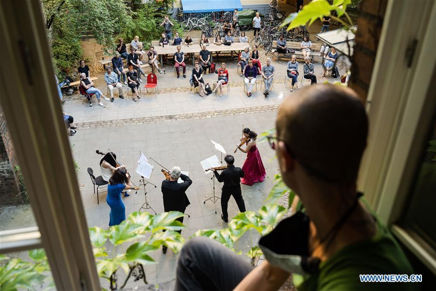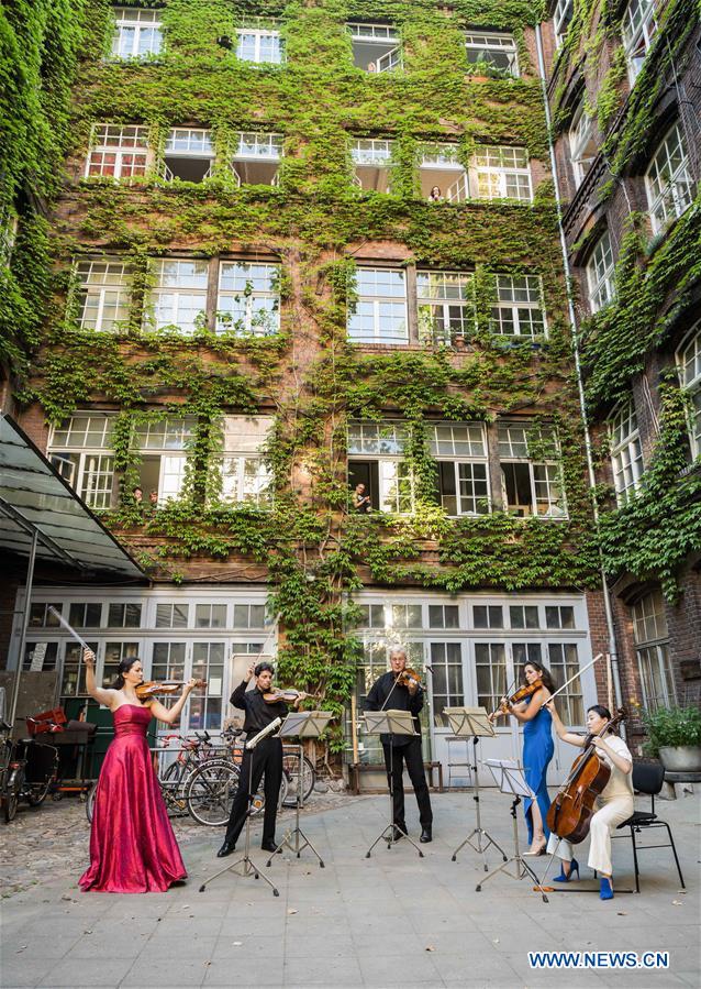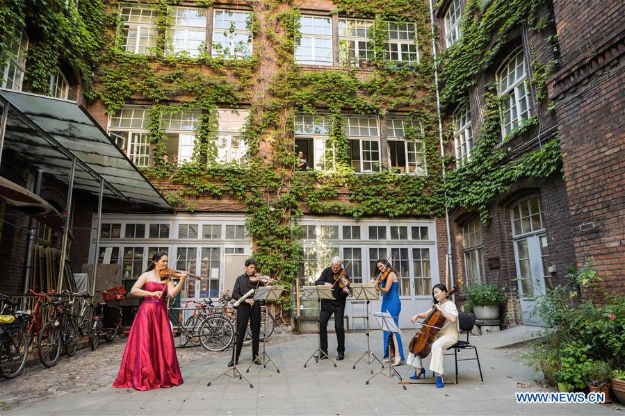 Members of the Staatskapelle Berlin orchestra perform during a backyard concert in Berlin, capital of Germany, on June 23, 2020. (Photo by Peter Adamik/Xinhua)