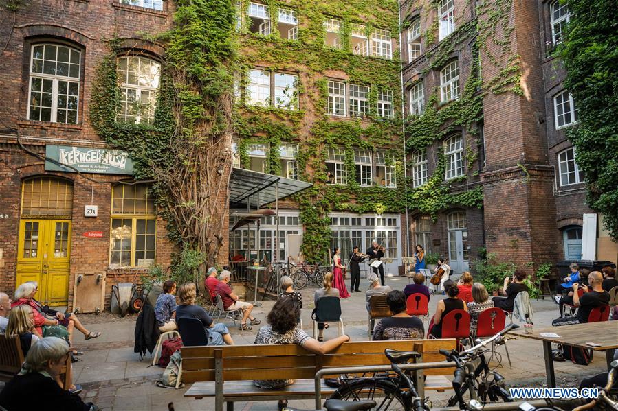 People watch a backyard concert performed by members of the Staatskapelle Berlin orchestra in Berlin, capital of Germany, on June 23, 2020. (Photo by Peter Adamik/Xinhua)