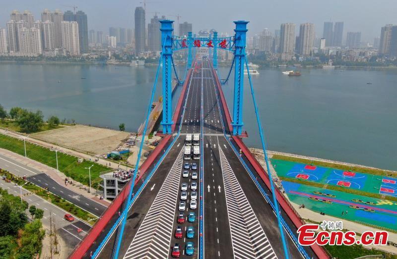 Aerial photo shows the 2.6-kilometer-long three-tower suspension bridge over the Hanjiang River in Xiangyang, Hubei Province, June 24, 2020. The Fengchu suspension bridge with the design speed of 60 kph, a length of 756 meters and a main span of 378 meters opens to traffic today. (Photo/China News Service)
