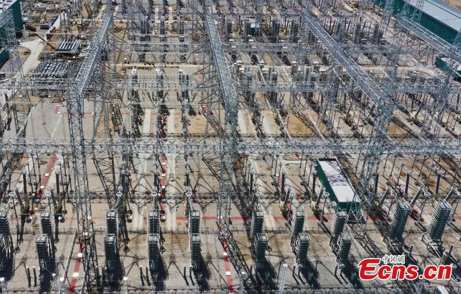 Photo taken on June 24, 2020, shows the 800±kilovolt ultra-high voltage (UHV) power line under construction. China's first ultra high-voltage power superhighway for transmitting clean energy extends 1,600 km across five provinces, from northwest China's Qinghai Province to central China's Henan Province. The project is scheduled to start operation in 2020. (Photo/China News Service)