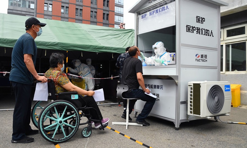 A medical worker collects a throat swab from a resident in a nucleic acid testing unit at a sampling site of Beijing Anzhen Hospital, Beijing, capital of China, June 24, 2020. (Xinhua/Ren Chao)
