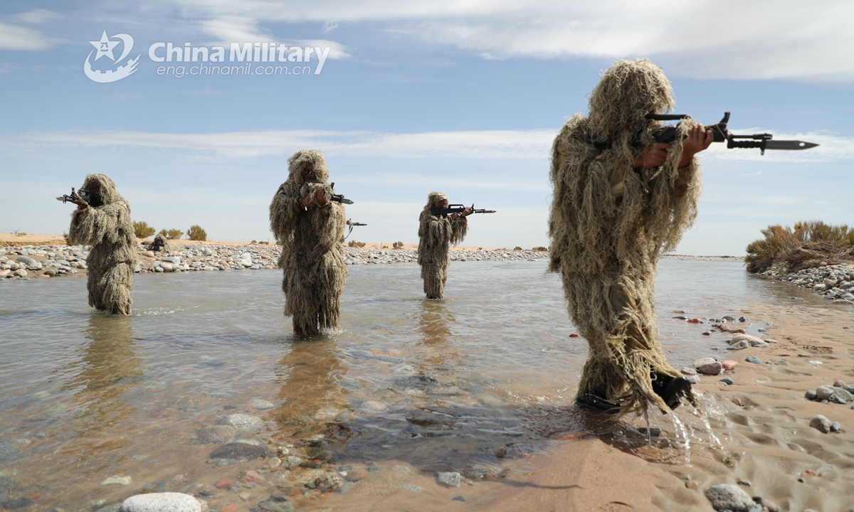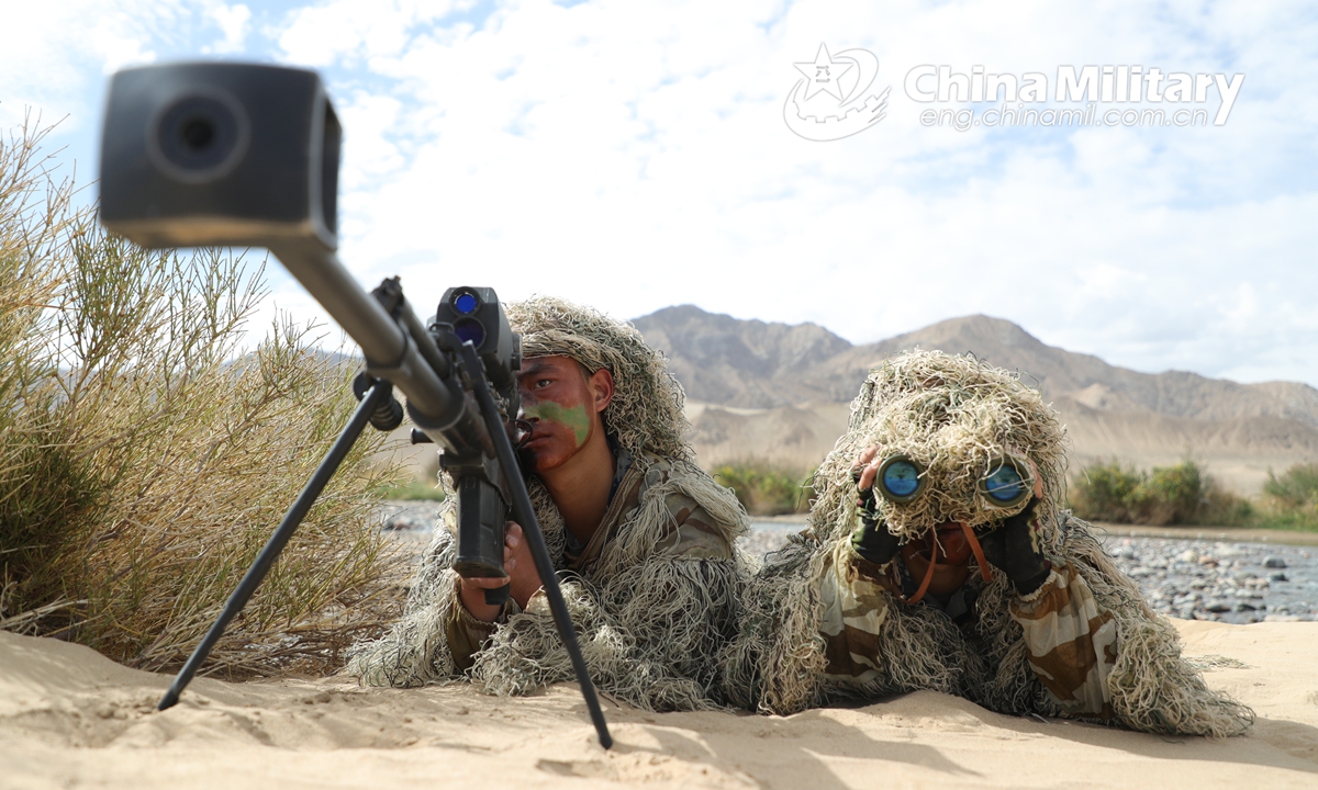 Reconnaissance soldiers wearing ghillie suits practice observation tactics using cover and concealment skills during a reconnaissance tactical training exercise on June 17, 2020. They are assigned to a reconnaissance detachment of a brigade under the PLA Air Force airborne troops. (eng.chinamil.com.cn/Photo by Wang Chenxi)