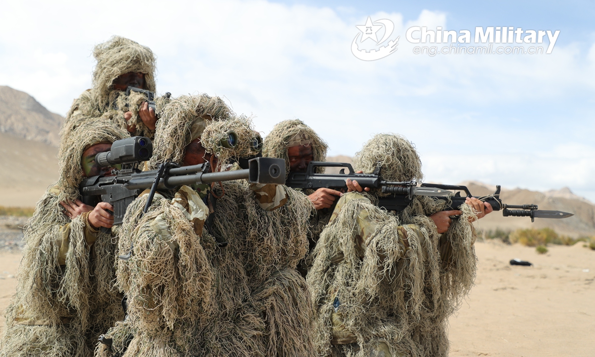 Battle team members wearing ghillie suits combine to form an over-the-shoulder firing position during a reconnaissance tactical training exercise on June 17, 2020. They are assigned to a reconnaissance detachment of a brigade under the PLA Air Force airborne troops. (eng.chinamil.com.cn/Photo by Wang Chenxi)