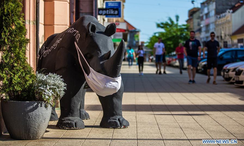 A rhino statue wearing a protective mask is seen in Osijek, Croatia, on June 24, 2020. (Davor Javorovic/Pixsell/Handout via Xinhua)