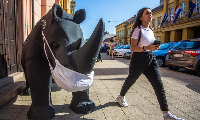 A girl walks by a rhino statue wearing a protective mask in Osijek, Croatia, on June 24, 2020. (Davor Javorovic/Pixsell/Handout via Xinhua)