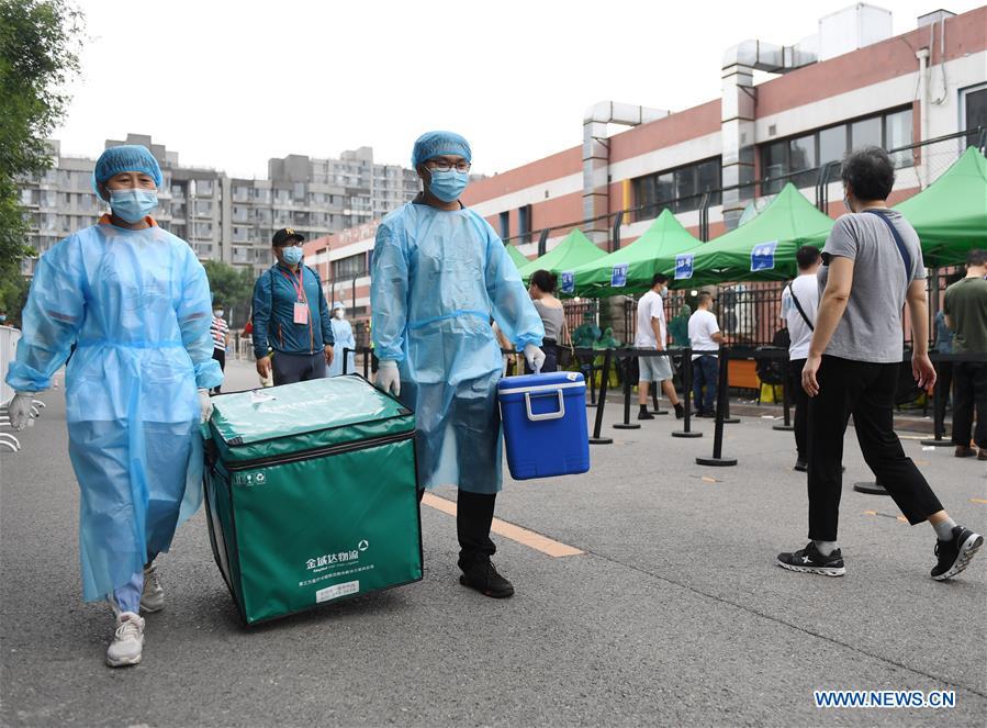 Staff members of KingMed Diagnostics transfer collected samples for nucleic acid test in Chaoyang District of Beijing, capital of China, June 25, 2020. With 2,422 sample collection points set up at 480 venues across the capital, Beijing can now offer more than 300,000 nucleic acid tests for COVID-19 every day. (Xinhua/Zhang Chenlin)