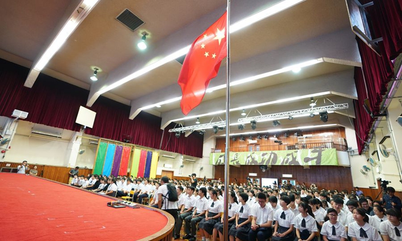 People attend a flag-raising ceremony at the Wong Cho Bau School in China's Hong Kong Special Administrative Region (HKSAR), Sept. 2, 2019. Photo: Xinhua