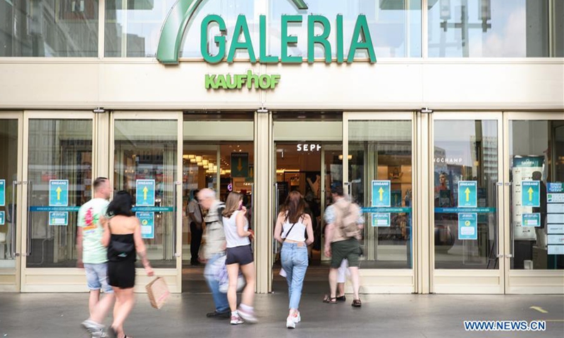 People enter a shopping mall at Alexanderplatz in Berlin, capital of Germany, on June 27, 2020. The contact restrictions in Berlin were lifted Saturday while the distance and hygiene rules continue to apply. (Xinhua/Shan Yuqi)
