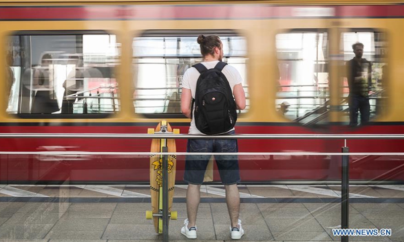 A man waits for an S-Bahn train in Berlin, capital of Germany, on June 27, 2020. The contact restrictions in Berlin were lifted Saturday while the distance and hygiene rules continue to apply. (Xinhua/Shan Yuqi)