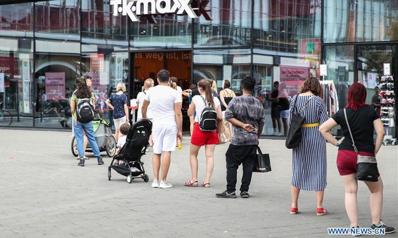 People queue to enter a shop in Berlin, capital of Germany, on June 27, 2020. The contact restrictions in Berlin were lifted Saturday while the distance and hygiene rules continue to apply. (Xinhua/Shan Yuqi)