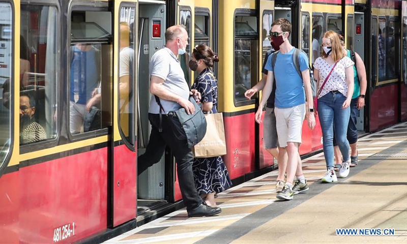 Passengers wearing face masks are seen by an S-Bahn train in Berlin, capital of Germany, on June 27, 2020. The contact restrictions in Berlin were lifted Saturday while the distance and hygiene rules continue to apply. (Xinhua/Shan Yuqi)