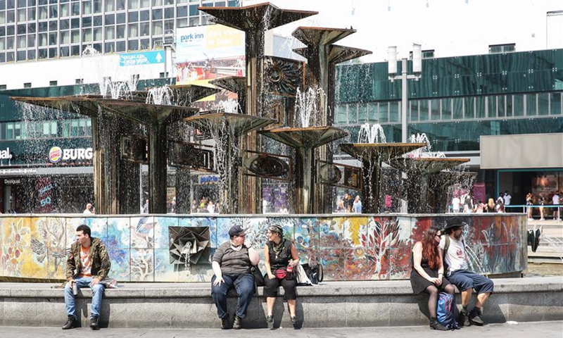 People sit with a distance by a fountain at Alexanderplatz in Berlin, capital of Germany, on June 27, 2020. The contact restrictions in Berlin were lifted Saturday while the distance and hygiene rules continue to apply. (Xinhua/Shan Yuqi)
