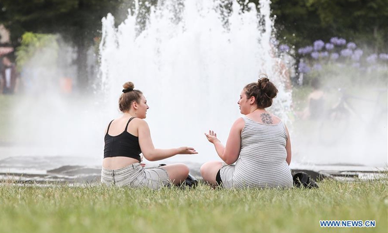 Women sit on the grass by a fountain at Lustgarten in Berlin, capital of Germany, on June 27, 2020. The contact restrictions in Berlin were lifted Saturday while the distance and hygiene rules continue to apply. (Xinhua/Shan Yuqi)