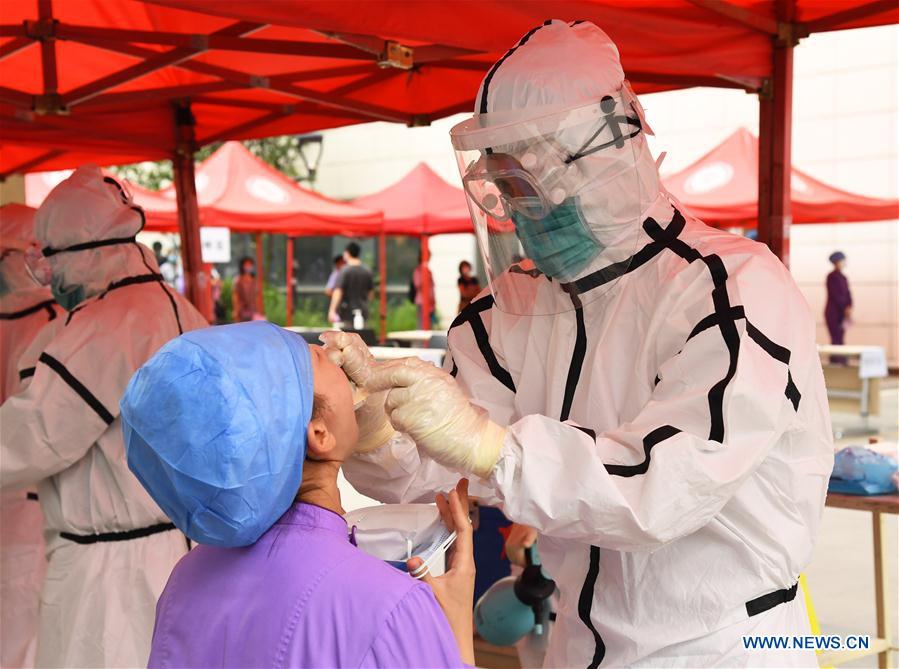 A medical worker (R) collects a throat swab from a woman at a nucleic acid testing site in Peking University Hospital, Beijing, capital of China, June 24, 2020. Peking University Hospital has strengthened management of the nucleic acid testing site to avoid risk from the crowd gathering. (Xinhua/Ren Chao)