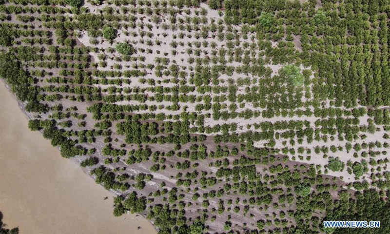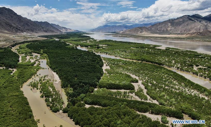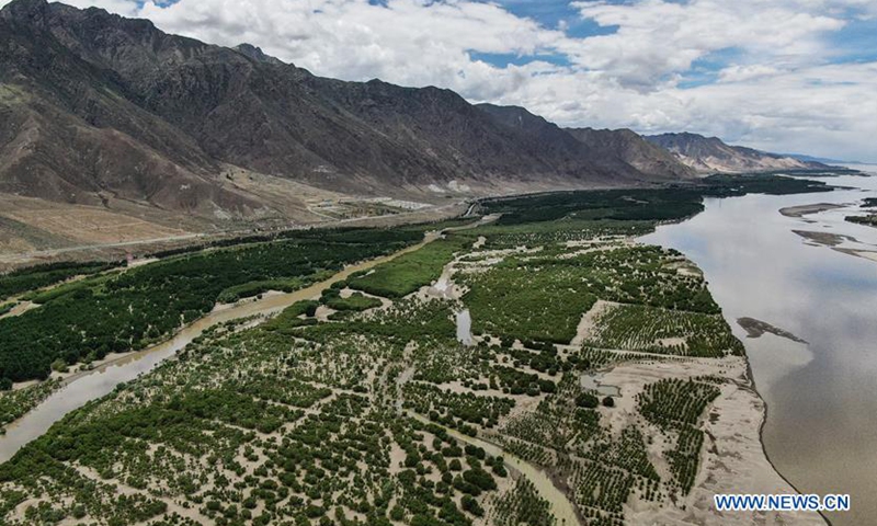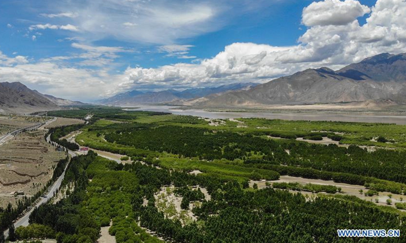 Aerial photo taken on June 27, 2020 shows a shelter forest along the Yarlung Zangbo River in Shannan, southwest China's Tibet Autonomous Region. (Xinhua/Jigme Dorje)