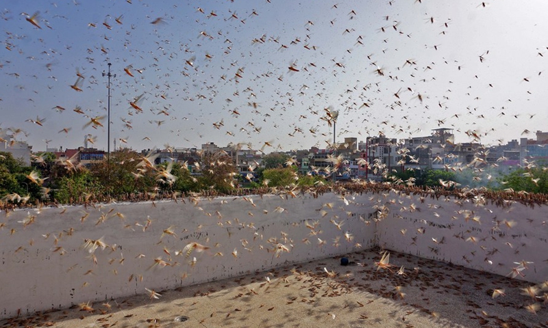 Photo taken on May 25, 2020 shows swarms of locusts in the residential areas of Jaipur, the capital city of India's western state of Rajasthan. (Str/Xinhua)