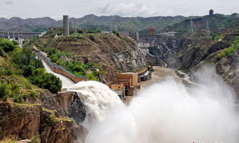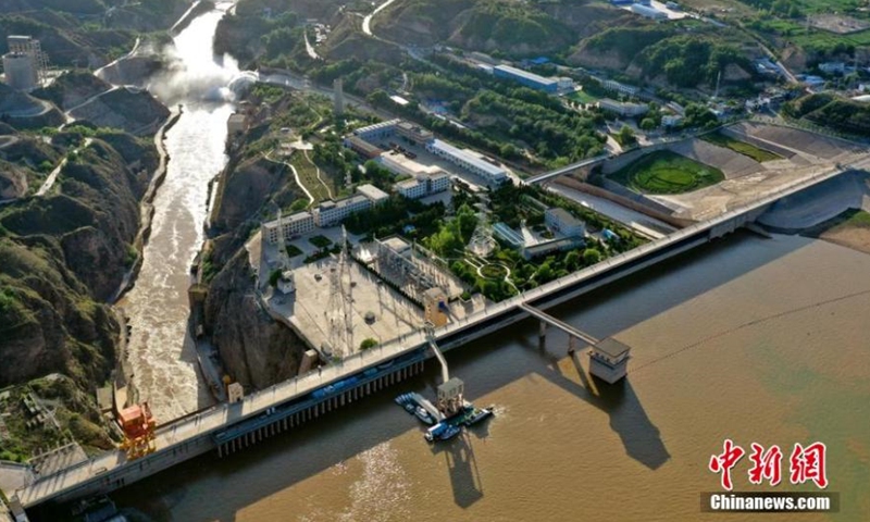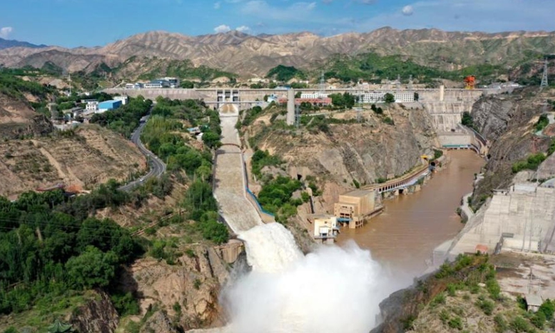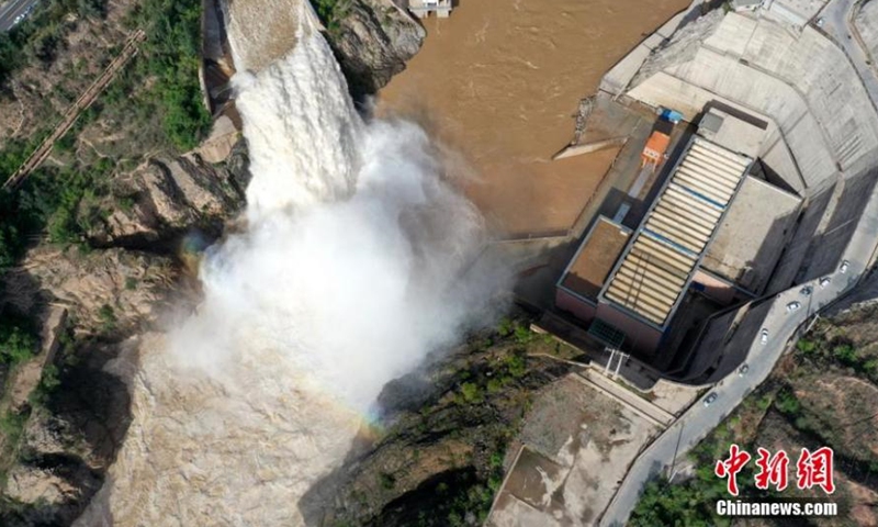 Aerial photo taken on June 26, 2020 shows water gushing out from a sluiceway of the Liujiaxia Reservoir on the Yellow River in Linxia Hui Autonomous Prefecture, northwest China's Gansu Province. (Photo/China News Service)
