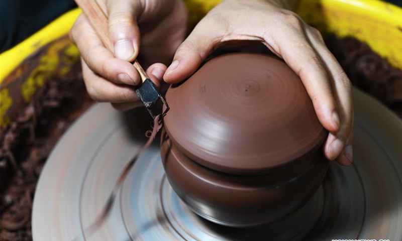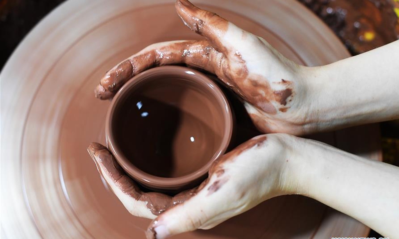 An artist demonstrates the making of Rongchang pottery at the Antao tourist town in Chongqing, southwest China, June 27, 2020. Tourists came to experience the making of Rongchang pottery, which has been listed as a national intangible cultural heritage, at the Antao tourist town in Chongqing during the Dragon Boat Festival national holiday. (Xinhua/Wang Quanchao)