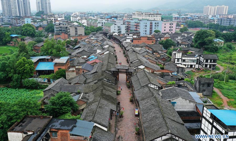 Aerial photo taken on June 27, 2020 shows a view of the Antao tourist town in Chongqing, southwest China. Tourists came to experience the making of Rongchang pottery, which has been listed as a national intangible cultural heritage, at the Antao tourist town in Chongqing during the Dragon Boat Festival national holiday. (Xinhua/Wang Quanchao)