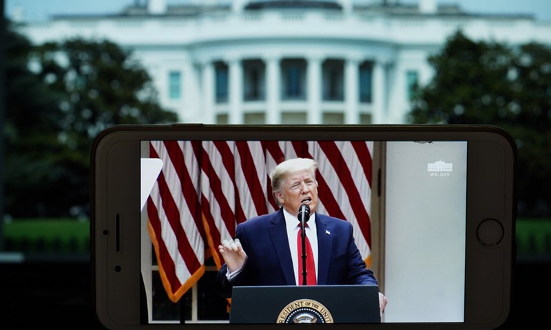Photo taken on May 29, 2020 shows the live broadcast of U.S. President Donald Trump speaking at a press conference at the White House in Washington D.C., the United States. (Xinhua/Liu Jie)