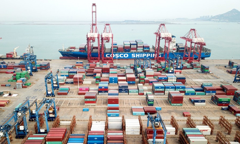 Photo taken on April 14, 2020 shows containers at the Lianyungang Port in Lianyungang City, east China's Jiangsu Province. (Photo by Geng Yuhe/Xinhua)
