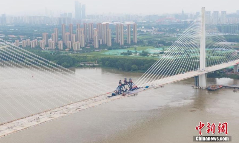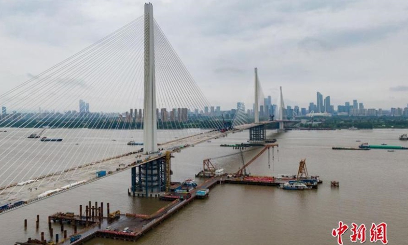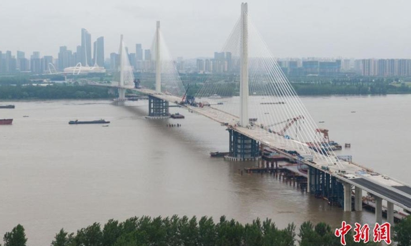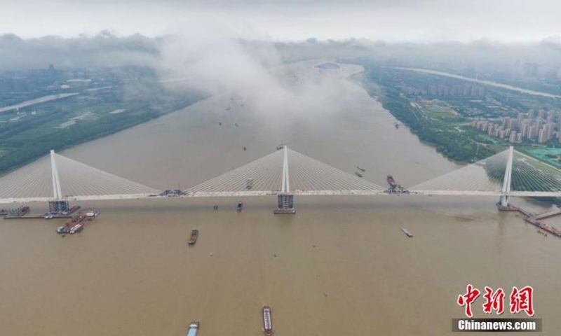 Photo taken on June 28, 2020 shows the construction site of the 5th Nanjing Yangtze river bridge in Nanjing, Jiangsu Province. The 5th Nanjing Yangtze river bridge finishes final closure smoothly. The bridge is expected to be completed by the end of 2020. (Photo/China News Service)