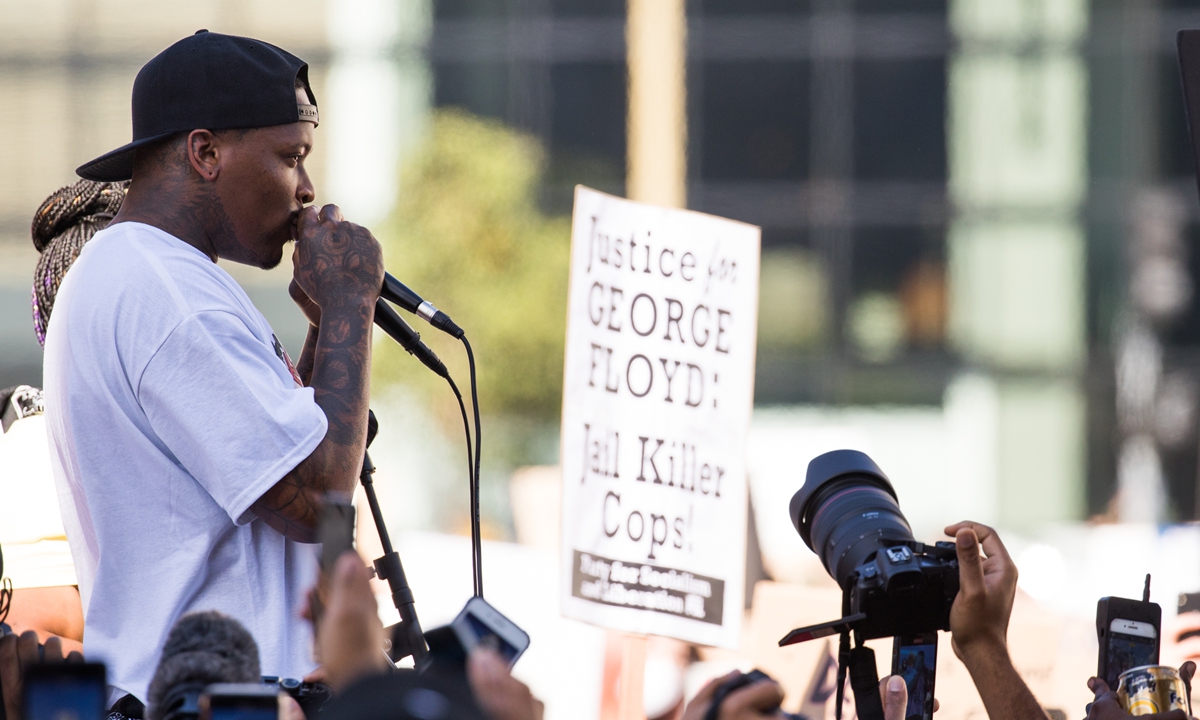 Rapper YG speaks during the YG x BLMLA x BLDPWR protest and march on June 7 in Los Angeles, California. Photo: AFP