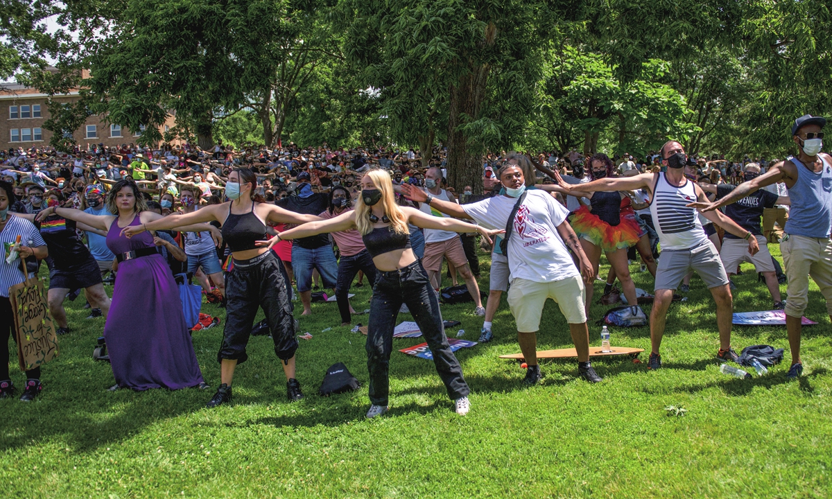 People participate in a movement exercise as a Pride and Black Lives Matter march ends at Loring Park on Sunday in Minneapolis, Minnesota, the US. Photo: AFP