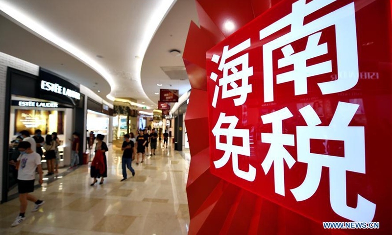 Customers shop at a duty-free shop in Haikou, capital of south China's Hainan Province, June 29, 2020. Hainan province will ease the limitations on duty-free shopping with the quota to be raised from 30,000 yuan (about 4,230 U.S. dollars) to 100,000 yuan per person per year, and provide more categories of duty-free commodities. The policy will come into effect on July 1. (Xinhua/Guo Cheng)