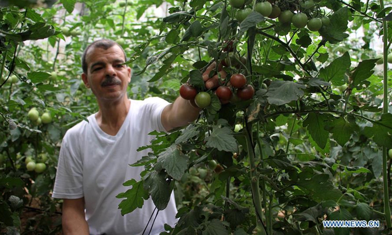 Maysara Mukhaimer, a Palestinian expert on Plant Biology, inspects newly-developed black tomatoes inside a greenhouse, in the southern Gaza Strip city of Rafah, June 30, 2020. (Photo by Rizek Abdeljawad/Xinhua)