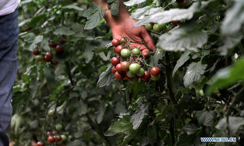 Maysara Mukhaimer, a Palestinian expert on Plant Biology, shows newly-developed black tomatoes inside a greenhouse, in the southern Gaza Strip city of Rafah, June 30, 2020. (Photo by Rizek Abdeljawad/Xinhua)