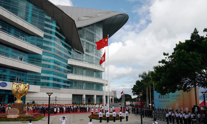 A flag-raising ceremony is held at the Golden Bauhinia Square to celebrate the 23rd anniversary of Hong Kong's return to the motherland, in Hong Kong, south China, July 1, 2020. (Xinhua/Li Gang)